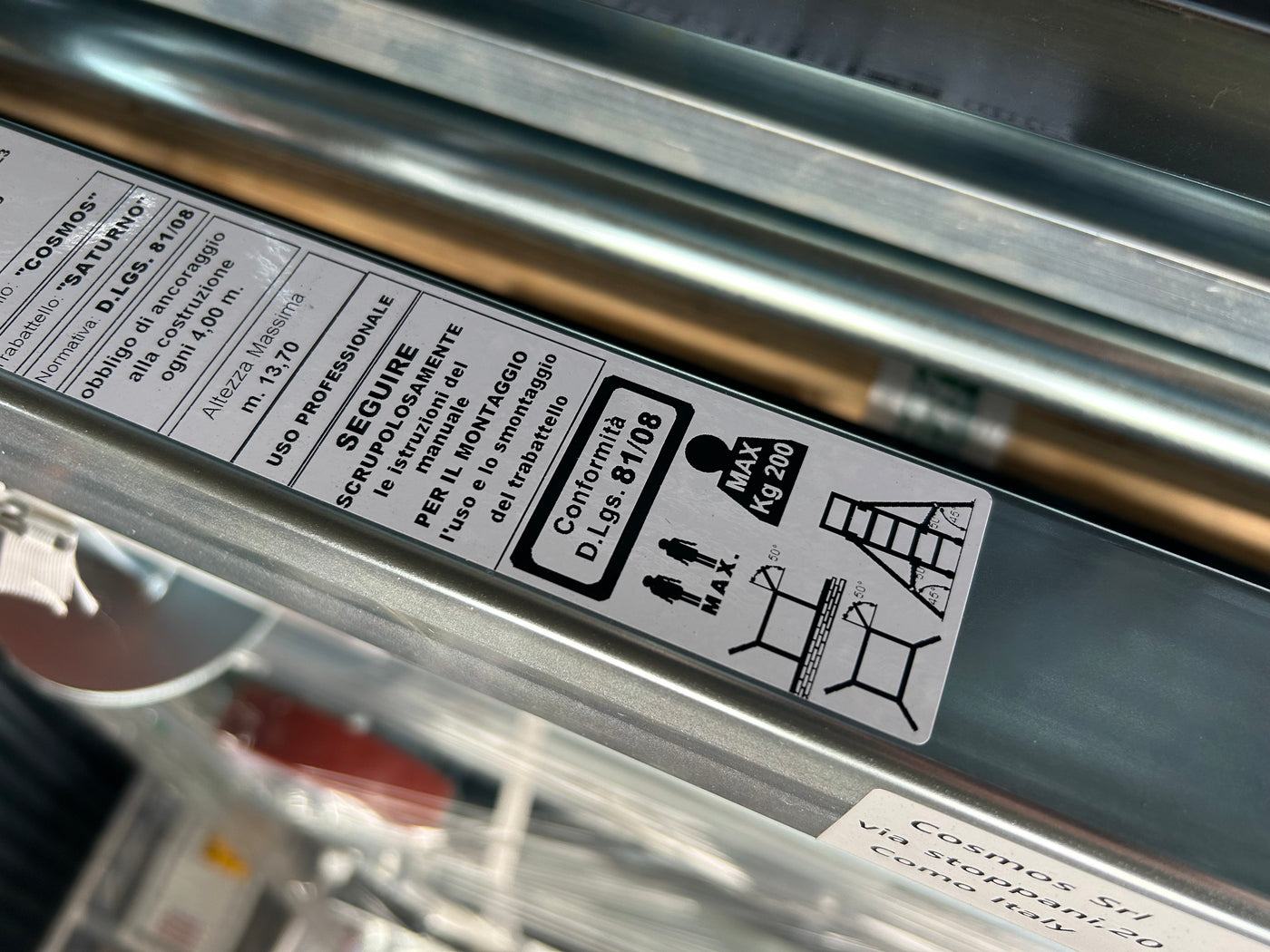 In Cosmos, la sicurezza dei nostri clienti è la nostra priorità. Seguiamo attentamente le normative italiane ed europee per garantire prodotti di alta qualità e sicuri. Le nostre certificazioni sono una prova tangibile del nostro impegno nella fornitura di soluzioni affidabili. Garantendo robustezza, resistenza e stabilità, vogliamo offrire un ambiente di lavoro sicuro per gli operatori e ridurre il rischio di incidenti per gli utenti finali. Scegliere le nostre scale e trabattelli significa fare una scelta responsabile per la tua sicurezza.